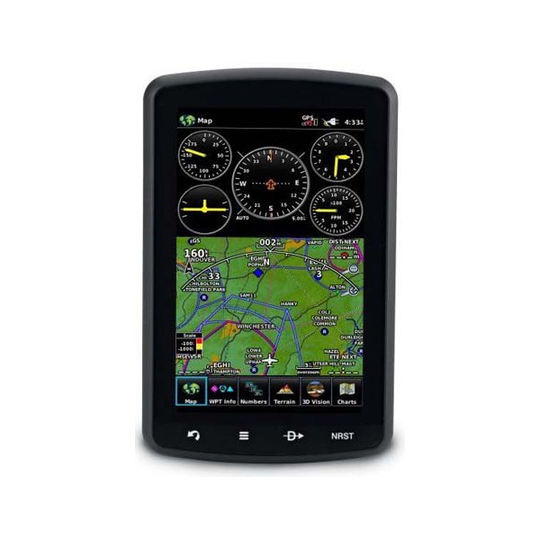 revolucionaria Vision 3D Vision muestra una tecnología virtual TRI-DIMENSIONAL de la aeronave con una perspectiva simulada  sobre el terreno circundante en la pantalla del GPS, esta característica sólo estaba disponible en paneles de navegacion para Aviones grandes y en consecuencia su costo es elevado cono respecto a la serie Garmin Aereo Portable.